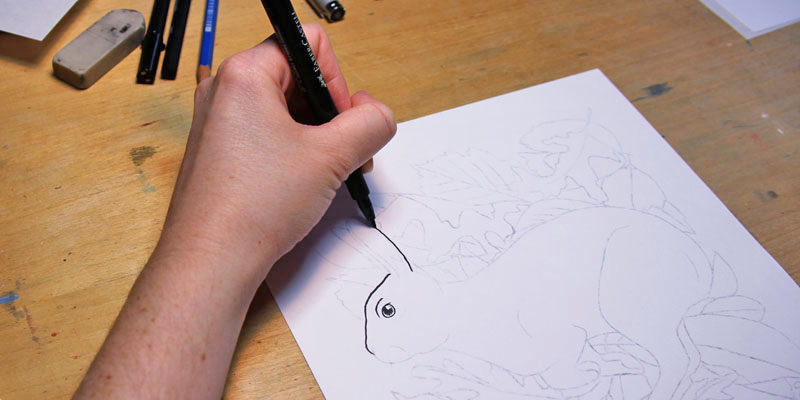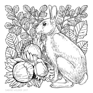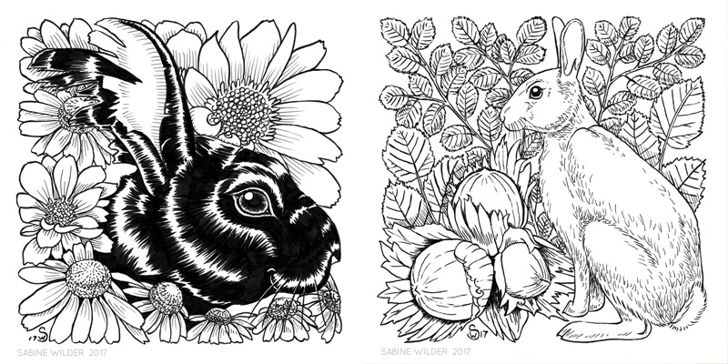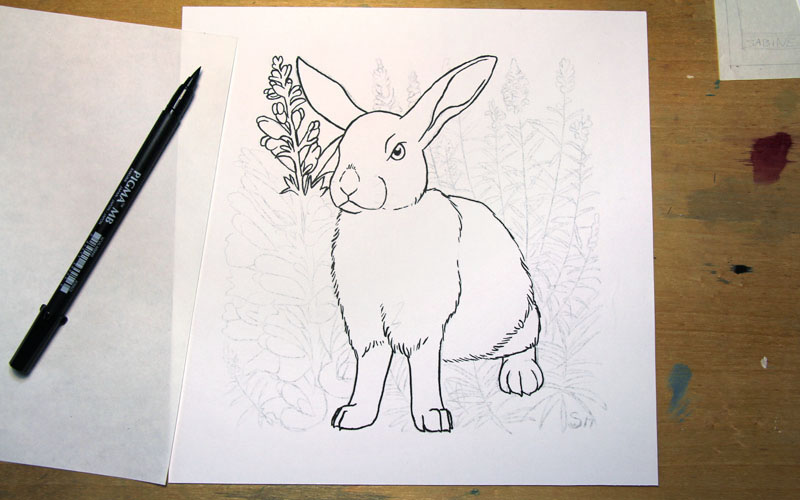 Thumbnails in hand and reference photos picked, I was ready to start drawing. I was excited to start but nervous as well. What if this project didn't turn out? Well, I had lots of time to get the pencil drawings right before I started inking. No problem. I started with Hazel and he took me a few hours. I fussed a lot over him, redrawing the sketch several times, but I was fairly happy with it when I was done. The other rabbits went by much quicker as I got used to drawing the sketches.