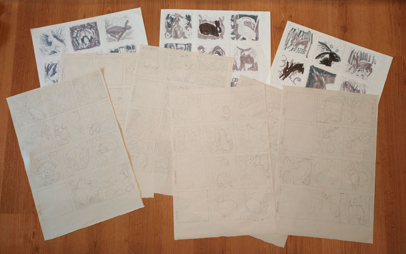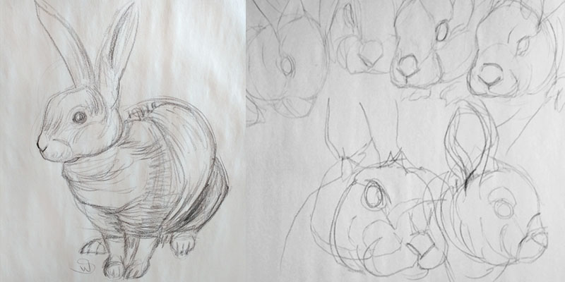 As one last effort at organization, I chose the best thumbnail for each rabbit and made a very rough value sketch for each one. I hoped that this would help in the final drawings to show me where I needed more line work or to make more darks and also to prevent me from filling in areas that should be left light. I was excited to see everything shaping up, but not all of my preparation would prove useful, as I would soon find out.