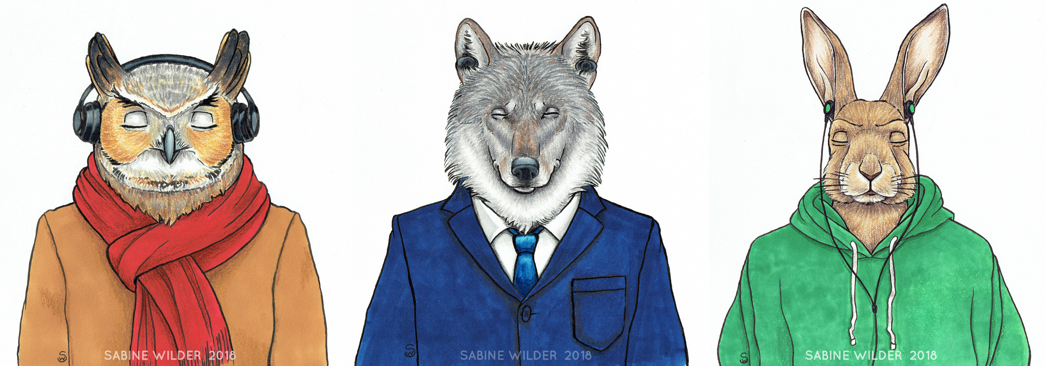 For this series I drew different anthropomorphic animals enjoying a music break. I can almost imagine them riding the subway or walking to work. I had to think of the placement of their ears though, which would have changed where the ear pieces went and how a human headset wouldn't have worked for some of them. Done with alcohol based markers for the base colours, then colour pencils over top for details and fur textures.