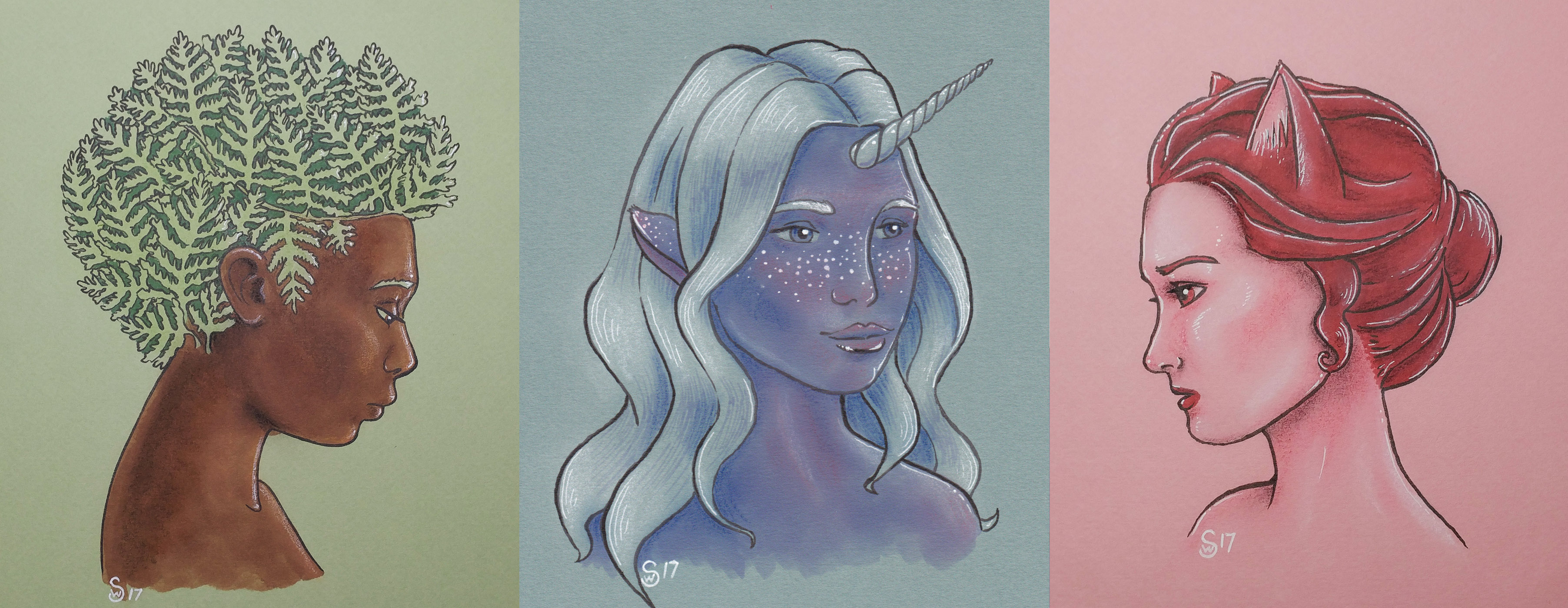 I drew these for Inktober in 2017, but I didn't get very far with the challenge. Still, I think they make a great trio. I used different coloured Canson paper for each, letting the natural colours of the paper come through for different elements. The colour is done with alcohol based markers and coloured pencils.